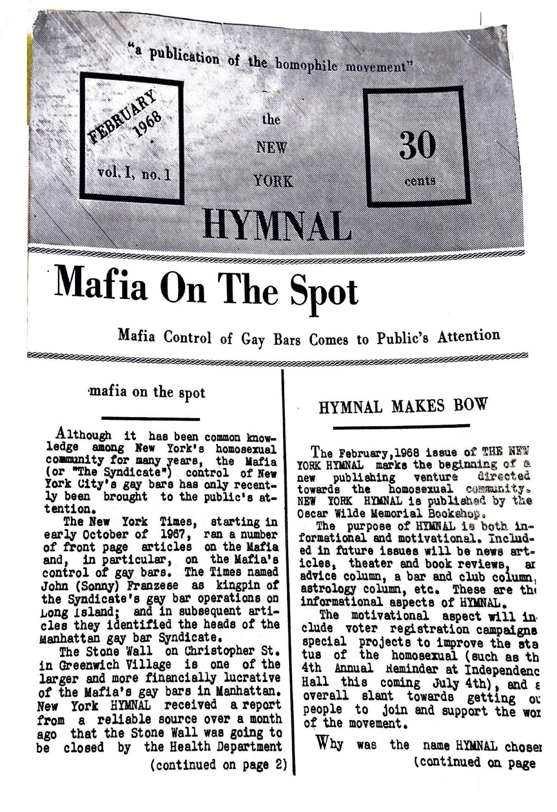 The HYMNAL, driven by young people, anticipated the spirit of the Stonewall Uprising a year later. They wrote articles in the preceding year calling out the harm of the Stonewall Inn on the local gay community—exposing the corruption of Stonewall’s owners, investors, and the police. The Homophile Youth Movement of NY (HYMN), the organizing group behind the publication, distributed their work through pamphlets at gay bars and gathering spaces across the Village.